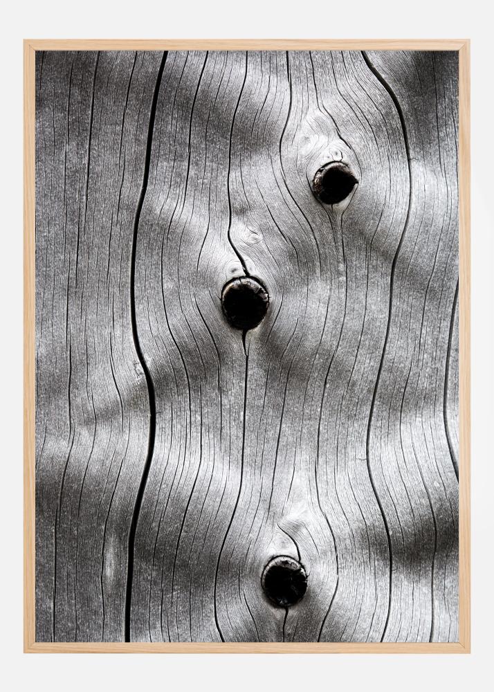 Ein Makro-Poster eines Baumstamms mit drei Löchern darin. Die Maserung des Holzes ist deutlich zu erkennen, während sich die Linien des Baumstammes nach oben schlängeln. Drei dunkle Löcher öffnen sich an verschiedenen Stellen entlang dieser Linien und verleihen dem Stamm eine gewisse Textur. In Kombination mit einer grünen Wand ergibt sich ein natürlicheres Erscheinungsbild.