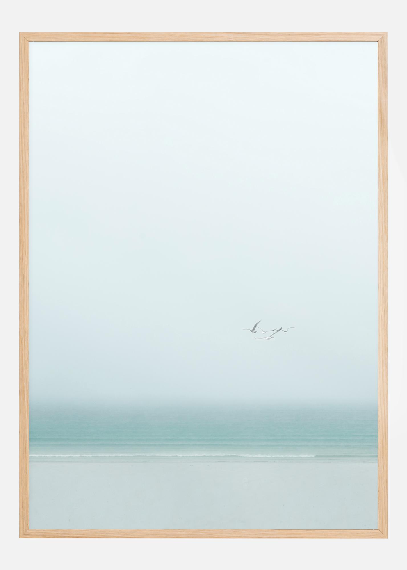 Ein einfaches Poster von zwei Vögeln, die über das Meer fliegen. Im Hintergrund sind sowohl das Meer als auch der Himmel in so sanften Weiß- und Blautönen gehalten, dass man kaum erkennen kann, wo das eine anfängt und das andere aufhört. Die Farben sind beruhigend und nur die Bewegung der beiden Vögel sticht in diesem eleganten, aber einfachen Poster ins Auge.