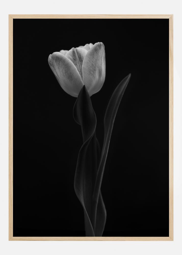 Ein einfaches Naturposter mit einer einzelnen weißen Tulpe vor einem schwarzen Hintergrund. Bringen Sie einen Hauch von Eleganz in Ihr Zuhause, indem Sie dieses Poster an eine schlichte farbige Wand hängen, damit die Blume richtig zur Geltung kommt.