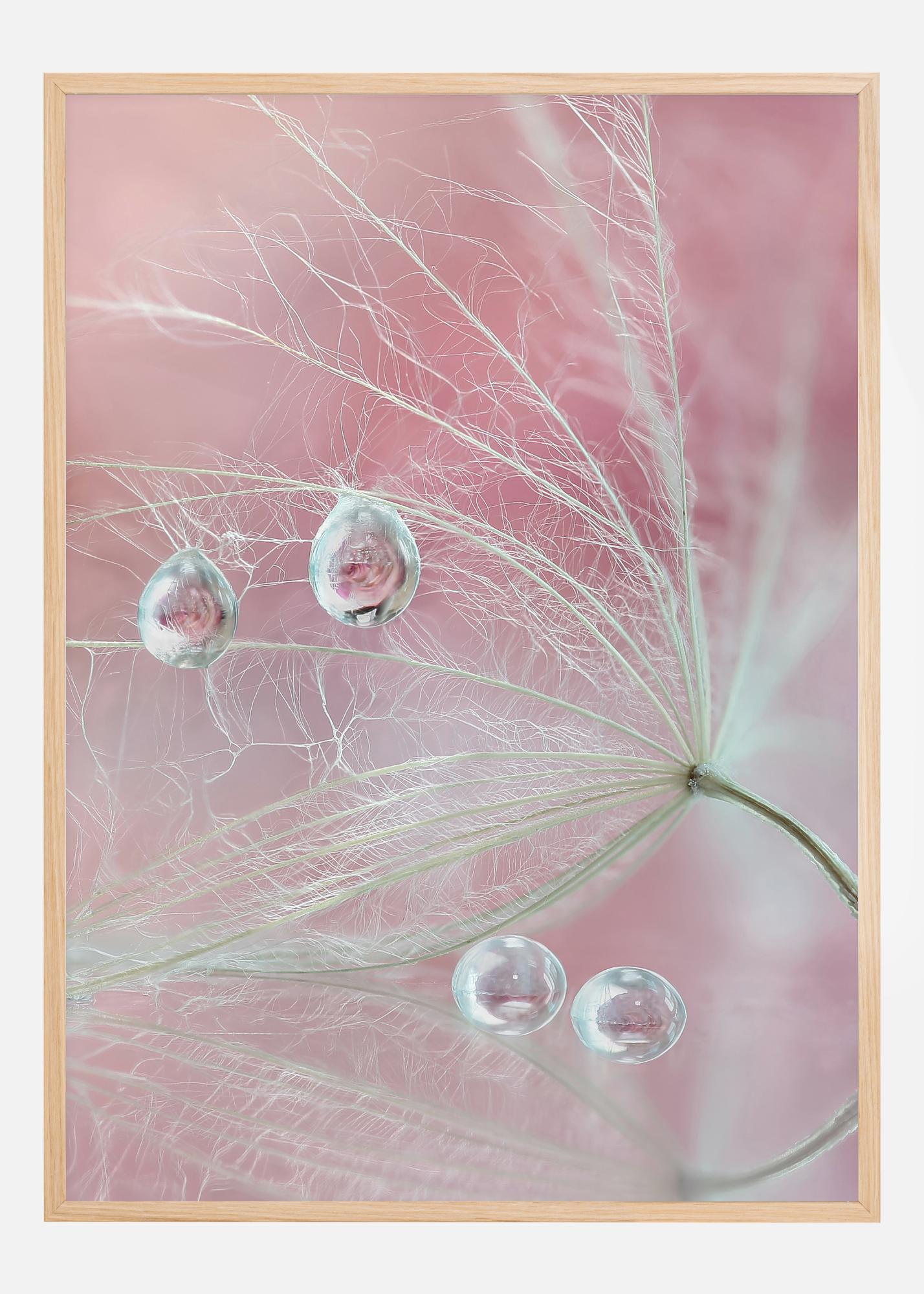 Ein elegantes Poster mit einem spinnenartigen Blütenkopf, an dessen zerbrechlichen Enden zwei Wassertropfen perlen. Ein hellrosa Hintergrund leuchtet durch die perfekten Wassertropfen, die kurz vor dem Abfallen von der Blüte hängen. Genießen Sie das empfindliche Gleichgewicht der Natur.