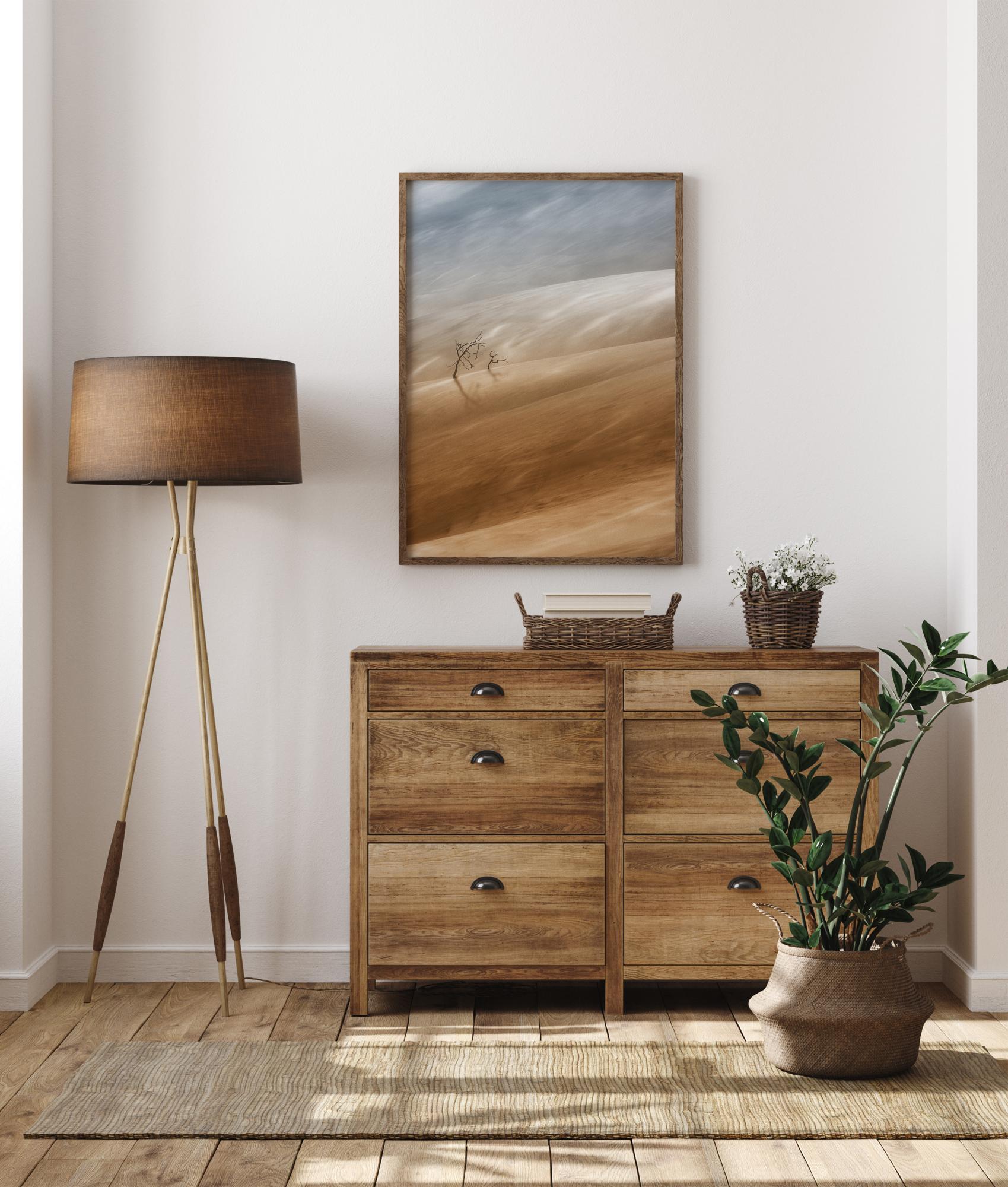 Ein weitläufiger Wüstenausblick mit zwei einsamen Bäumen. Die weichen, pastellfarbenen Gelb- und Blautöne schaffen eine harmonische Vision für jeden Raum im Haus. Lassen Sie sich von dieser atemberaubenden Szene mitreißen.