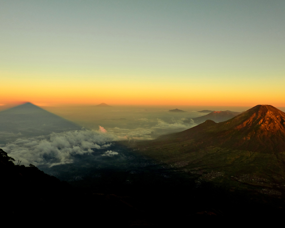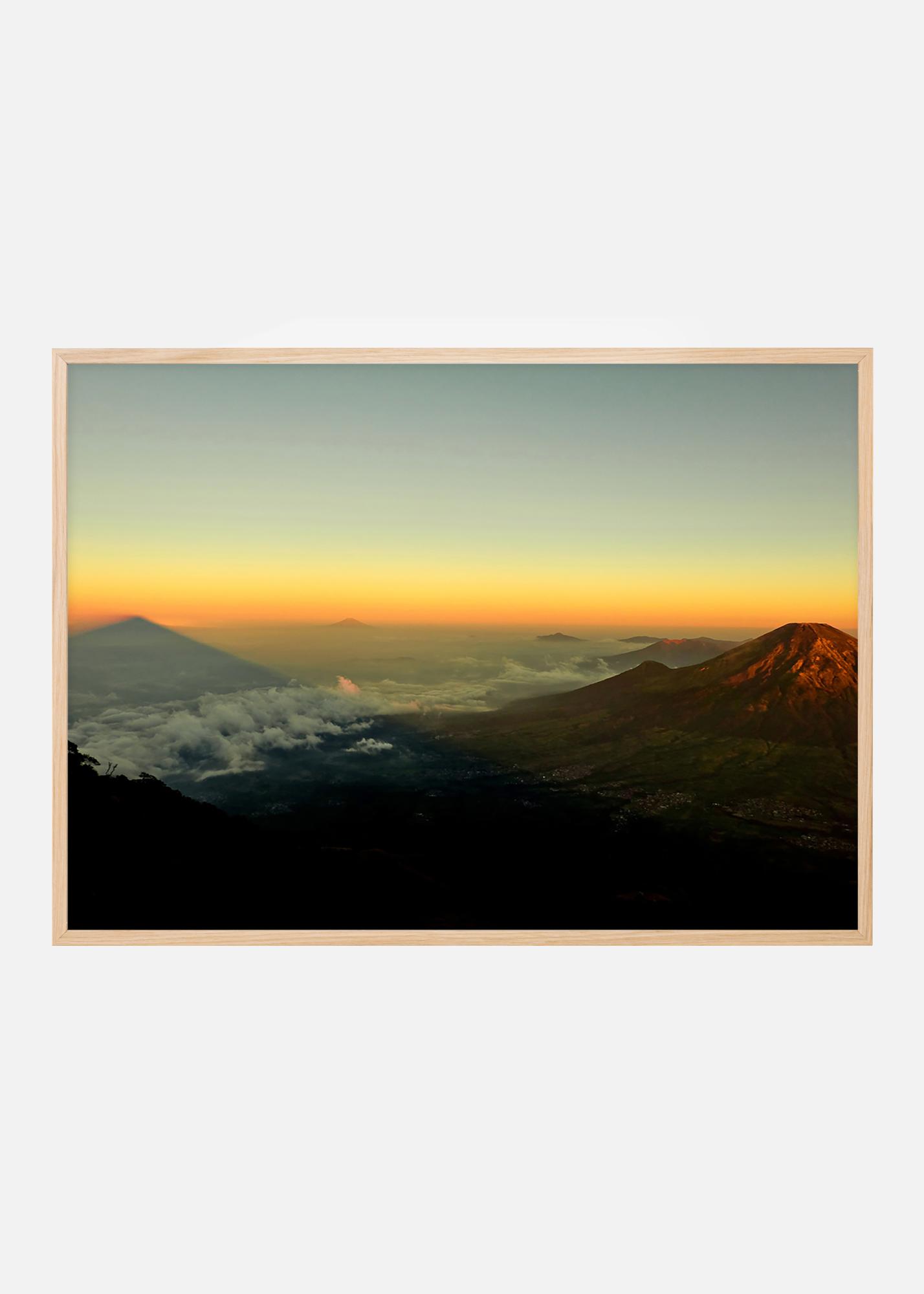 Druck mit einer großartigen Aussicht von oberhalb der Wolken über spitze Berge beim Sonnenaufgang. Die gelborangen Töne in der Skyline und der dunkle Vordergrund verleihen dem Bild eine dramatische Ader, die es zu einem Blickfang macht. Das Bild passt mit seiner stilreinen Bildsprache in alle Einrichtungsstile, kombiniere es mit einem Rahmen, der die Farben im Bild hervorhebt.
