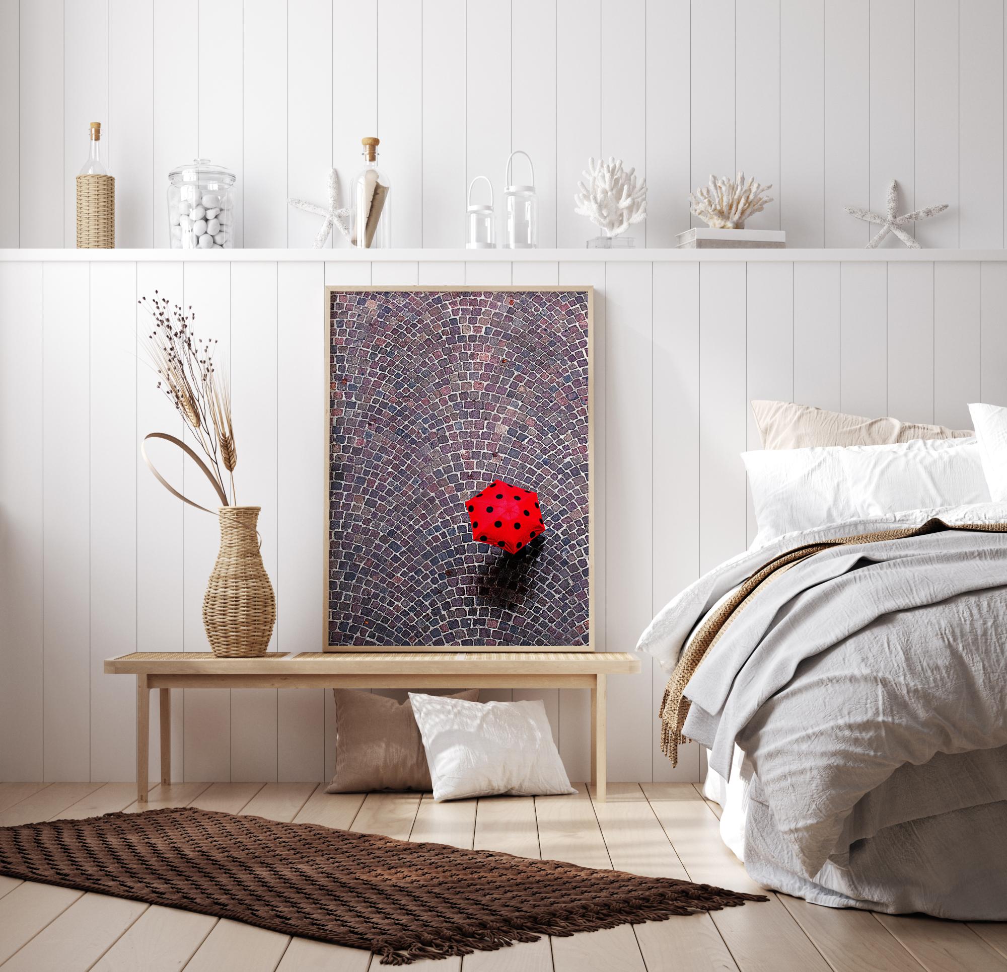 Ein urbanes Poster eines Bürgersteigs von oben. Ein leuchtend roter Regenschirm mit schwarzen Flecken setzt einen hellen Akzent auf dem blau-lila Mosaikboden. Dieser Marienkäfer-Regenschirm bildet einen witzigen Blickpunkt in diesem gemusterten und mosaikartigen Bild.