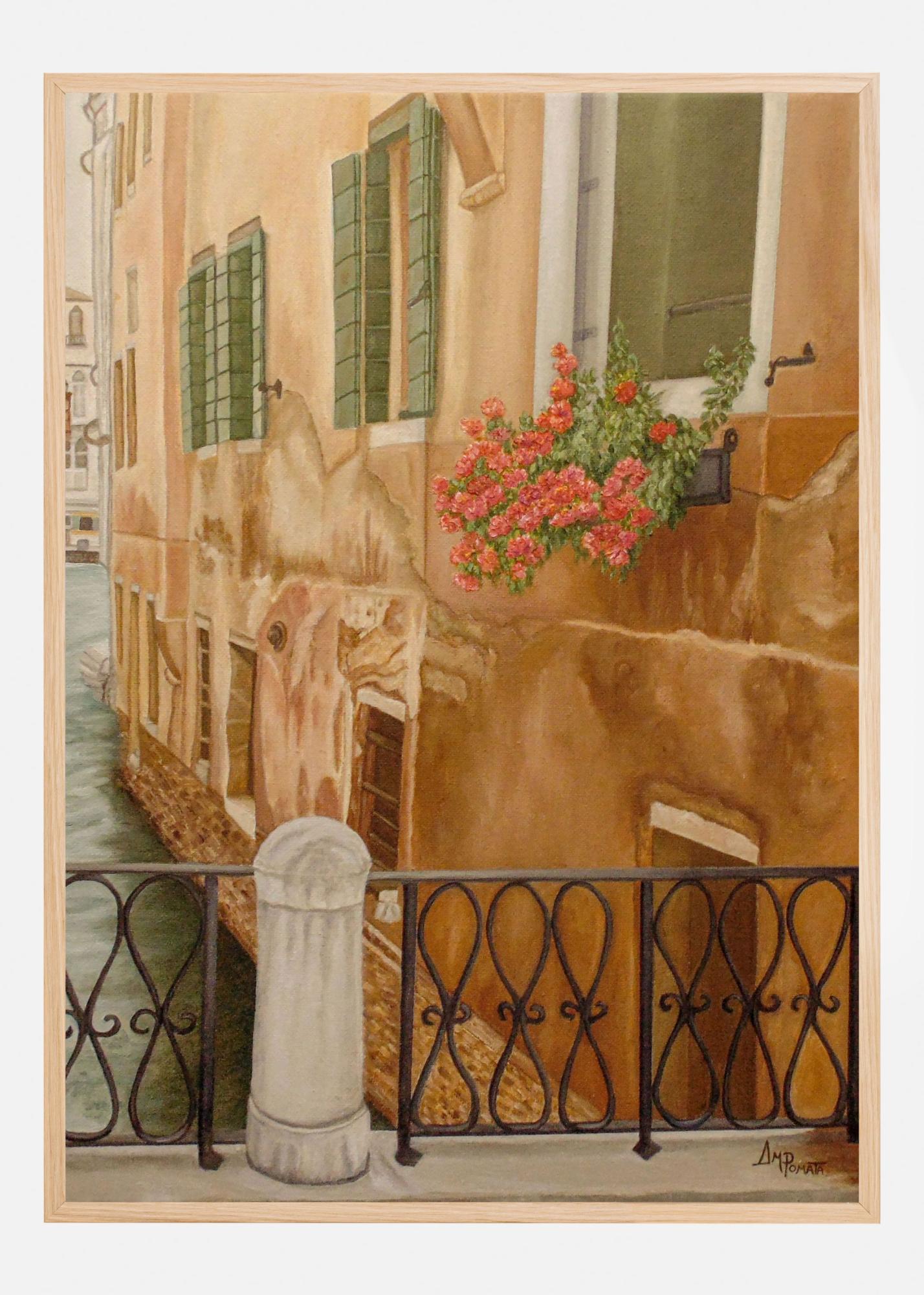 Die Details dieses Posters, wie die sanften Grünnuancen der Fensterläden und die subtilen Schattierungen in den Steinwänden, unterstreichen die erdigen Töne des Motivs. Der ruhige Kanal darunter fängt das Spiel des Lichts auf dem Wasser in einem erfrischenden Türkis ein. Ein perfekter Print für alle, die italienische Architektur lieben und sich in romantische Umgebungen träumen möchten.