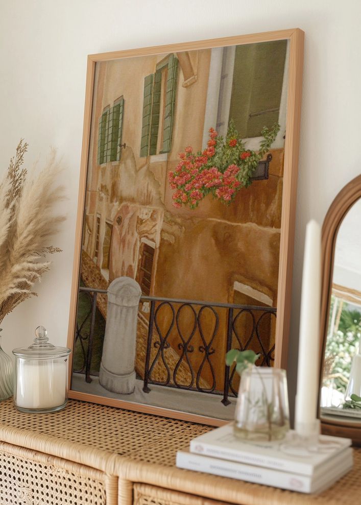 Dieses Poster fängt eine romantische Szene aus den malerischen Straßen Italiens ein, in der die Farben harmonisch zusammenspielen und ein zeitloses Gefühl schaffen. Das Bild zeigt ein älteres Gebäude mit warmen, rostbraunen und cremigen Wänden, die eine reiche Textur und Geschichte vermitteln. Grüne Fensterläden und hellrosa Blumen in einem Blumenkasten sorgen für einen lebendigen, natürlichen Akzent, während der Schwarz schmiedeeiserne Balkon einen eleganten Kontrast bildet.