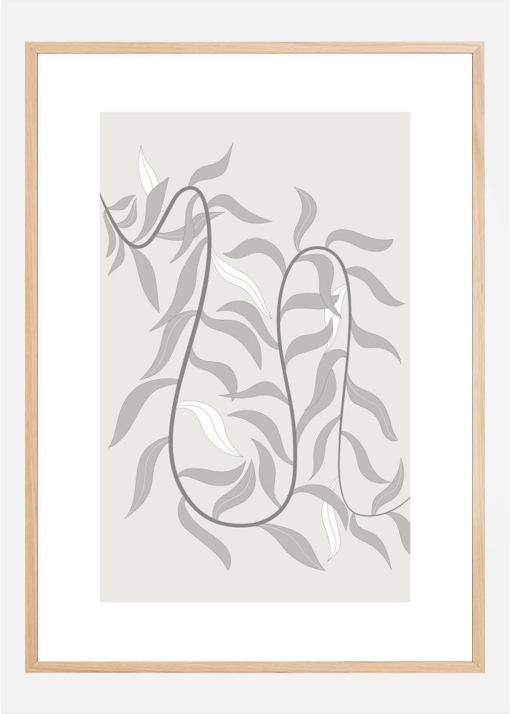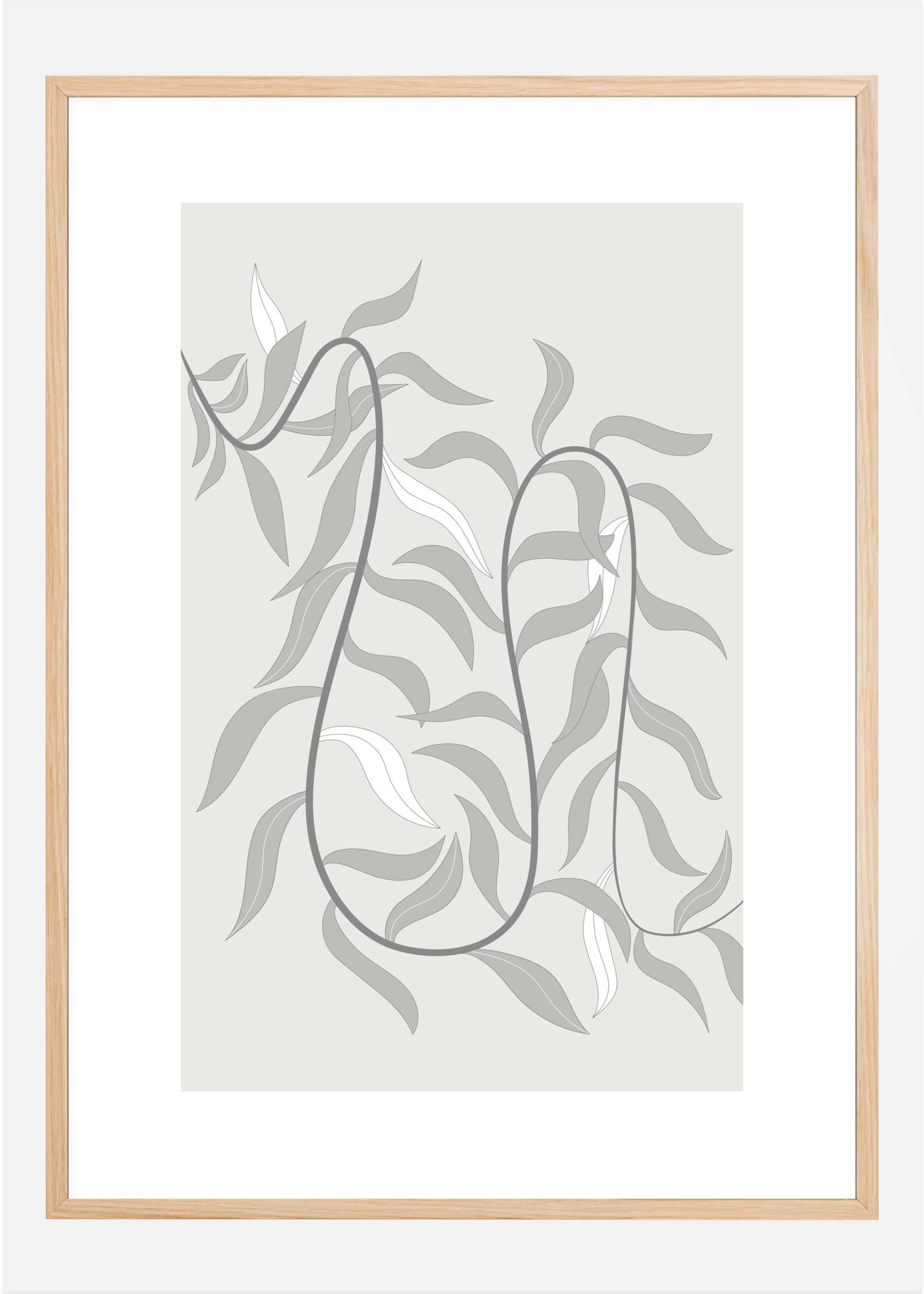 Ein abstraktes botanisches Poster mit einer schleichenden Rebe, die sich über das Poster schlängelt. Das Design ist ein einfacher Druckstil mit Blättern in Hellgrau und Weiß. Eine dunkelgraue Rebe schlängelt sich zwischen den Blättern hindurch und verbindet sie zu einer gewundenen Form. Kombinieren Sie es mit einer zartgrünen Wand, um einen blattreichen Effekt zu erzielen.