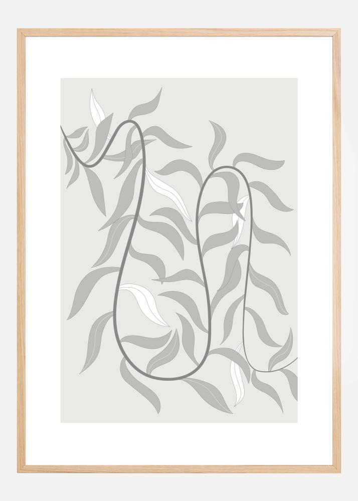 Ein abstraktes botanisches Poster mit einer schleichenden Rebe, die sich über das Poster schlängelt. Das Design ist ein einfacher Druckstil mit Blättern in Hellgrau und Weiß. Eine dunkelgraue Rebe schlängelt sich zwischen den Blättern hindurch und verbindet sie zu einer gewundenen Form. Kombinieren Sie es mit einer zartgrünen Wand, um einen blattreichen Effekt zu erzielen.