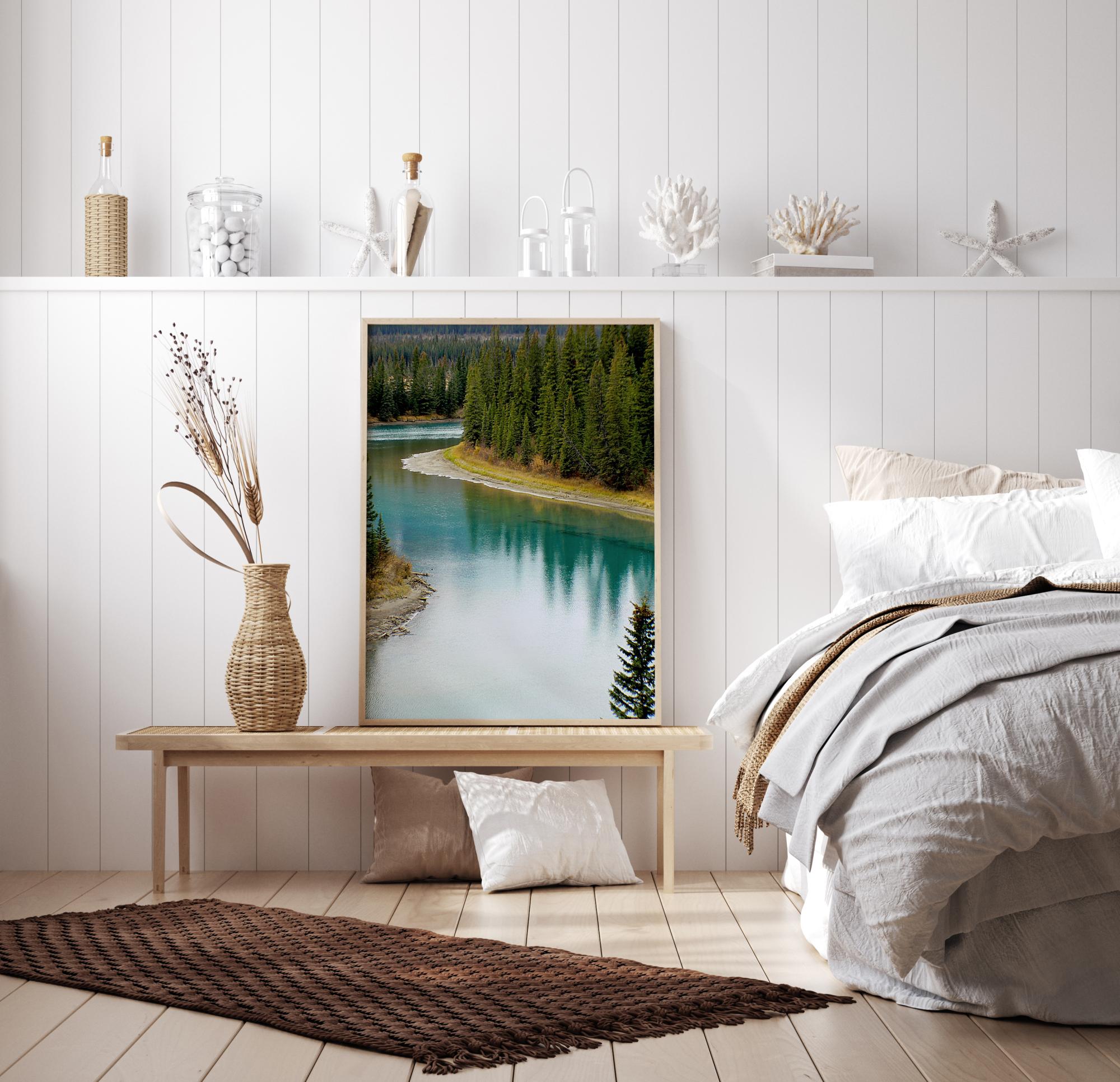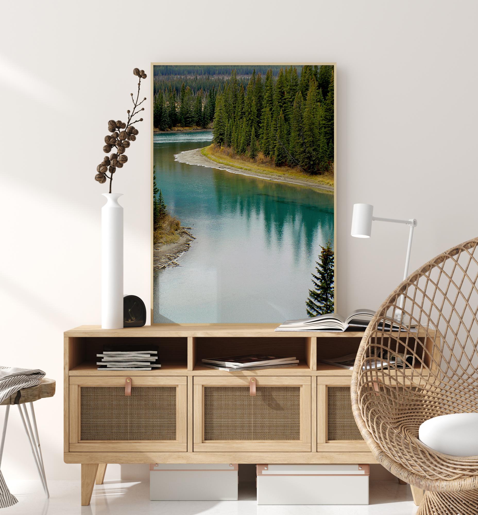Ein Waldposter, bei dem Tannenbäume die Ufer eines breiten Flusses säumen, der sich durch die Landschaft schlängelt. Die grünen Bäume stehen hoch, während sich der Wald in die Ferne verliert. Der breite Fluss hat eine fast regenbogenfarbene Tönung und fängt die hohen spitzen Reflexe der Bäume auf seiner Oberfläche ein.