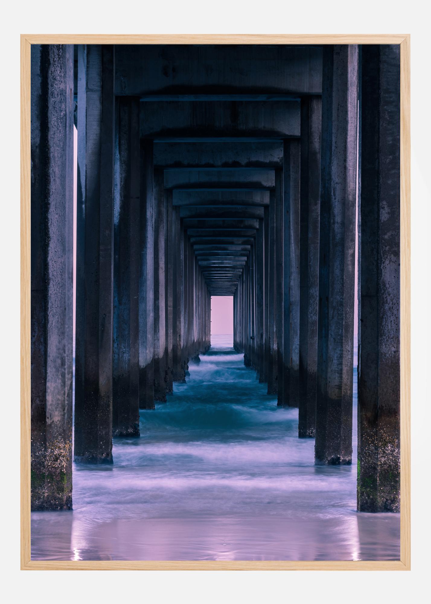 Ein dunkles Poster mit einem Korridor, der zu einem Licht am Ende des Tunnels führt. Dicke dunkelblaue Säulen säumen einen hellblauen Gang, obwohl die Decke über dem Gang auch ziemlich dunkel und bedrohlich ist. Folgen Sie dem helleren Weg, um das helle Licht in der Ferne zu erreichen und dem Raum mehr Tiefe zu verleihen.