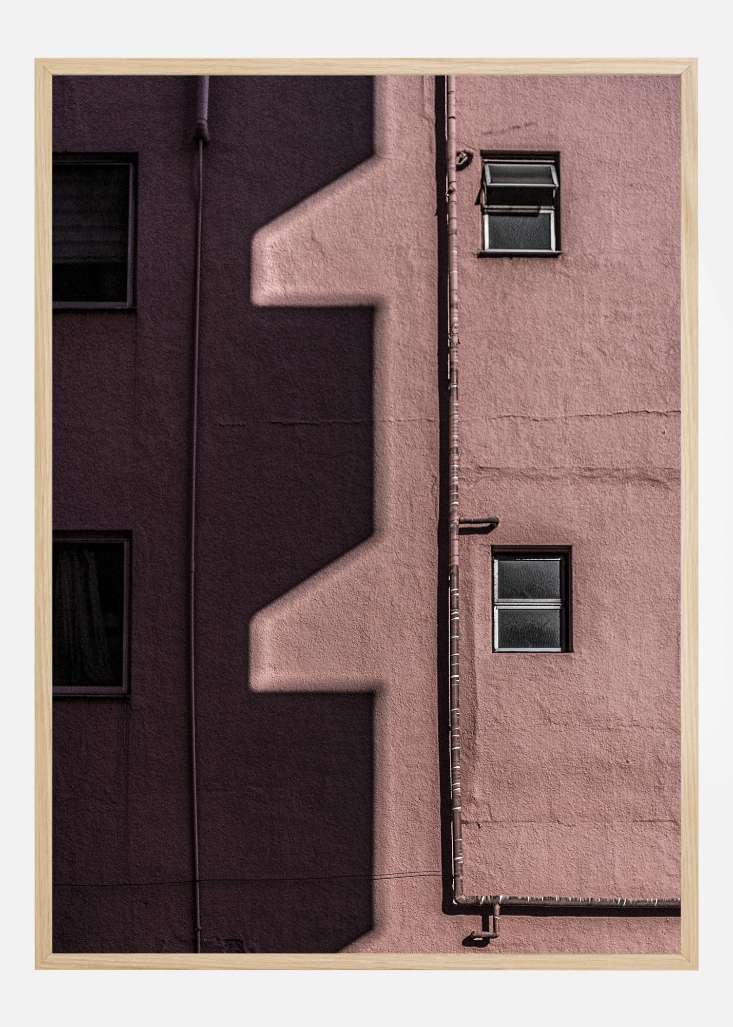 Ein Gebäudeposter mit der Außenansicht eines dunkelrosa Gebäudes. Schatten und Licht werfen seltsame Formen auf die Seite des Gebäudes. Die Fenster wirken wie Augen, die sich mit den Schatten, die wie Nasen aussehen, aneinanderreihen, so dass es scheint, als ob dieses Bild direkt auf Sie zurückstarrt.