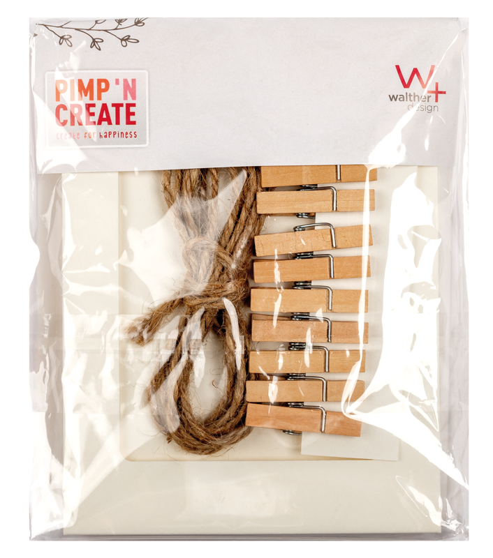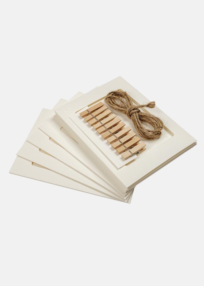 Fotogirlande mit 10 Papierbilderrahmen in Beige, für Fotos in 10x15 cm. Die Girlande hat eine Länge von 180 cm und 10 Holzklammern zum Befestigen am Juteseil. Die Bilderrahmen aus Papier sind unbeschichtet, was bedeutet, dass du sie neu bemalen oder nach Belieben dekorieren kannst.