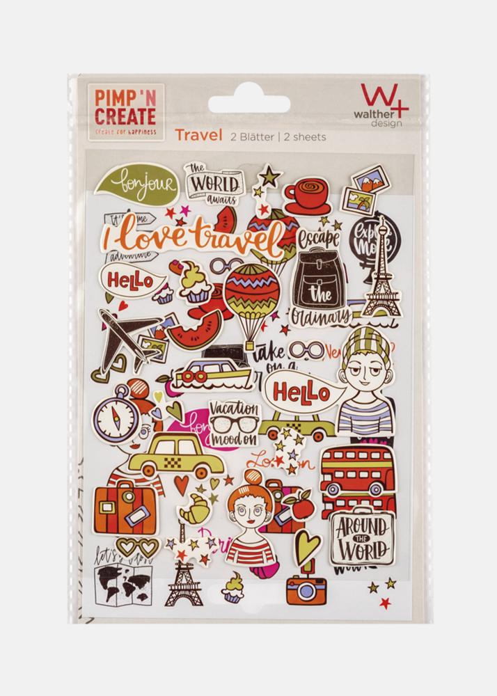 Selbstklebende Aufkleber mit Reisemotiven. Perfekt für kreatives Gestalten von Fotoalben, zum Dekorieren von Geschenken oder zum Erstellen von Glückwunschkarten. Die Verpackung enthält 1 Bogen 3D-Aufkleber und 1 Bogen flache Aufkleber.