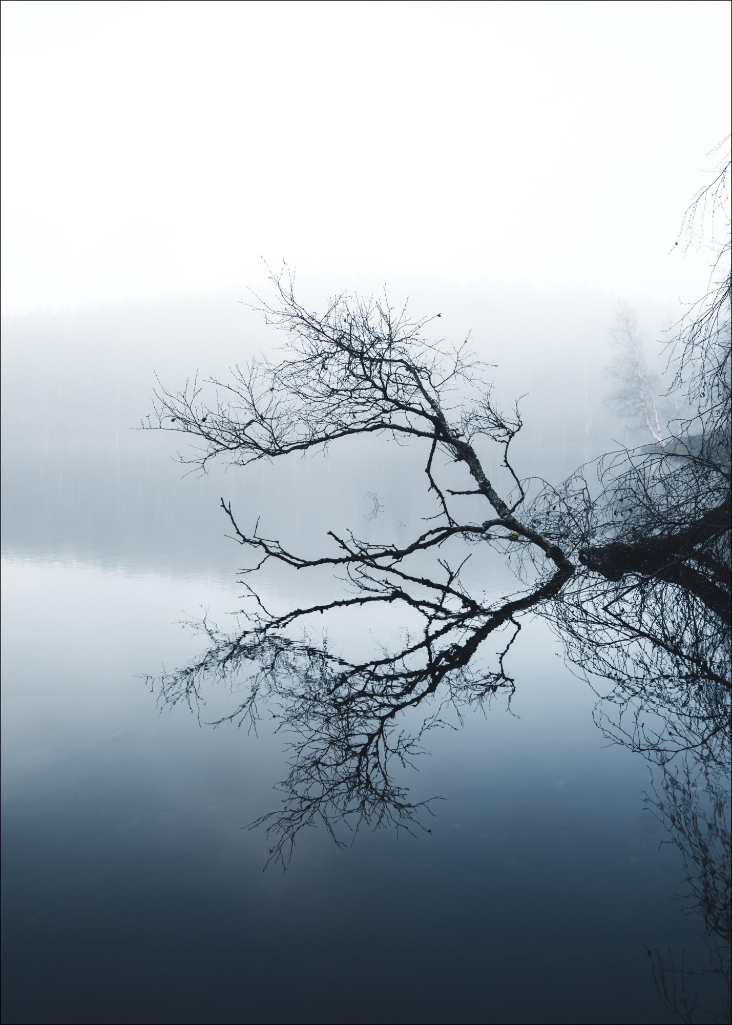 Ein weißes Poster eines weiten, stillen Sees mit einem toten Baum, der aus dem Wasser ragt. Wenn sich der Ast nach oben biegt, wirft er seine Reflexion auf den See und erzeugt so ein atemberaubendes Spiegelbild. Der weiße Himmel darüber hilft, zwischen dem echten Ast und seinem Spiegelbild zu unterscheiden. Die Blautöne verleihen einer warmen Wand eine kühle Note.