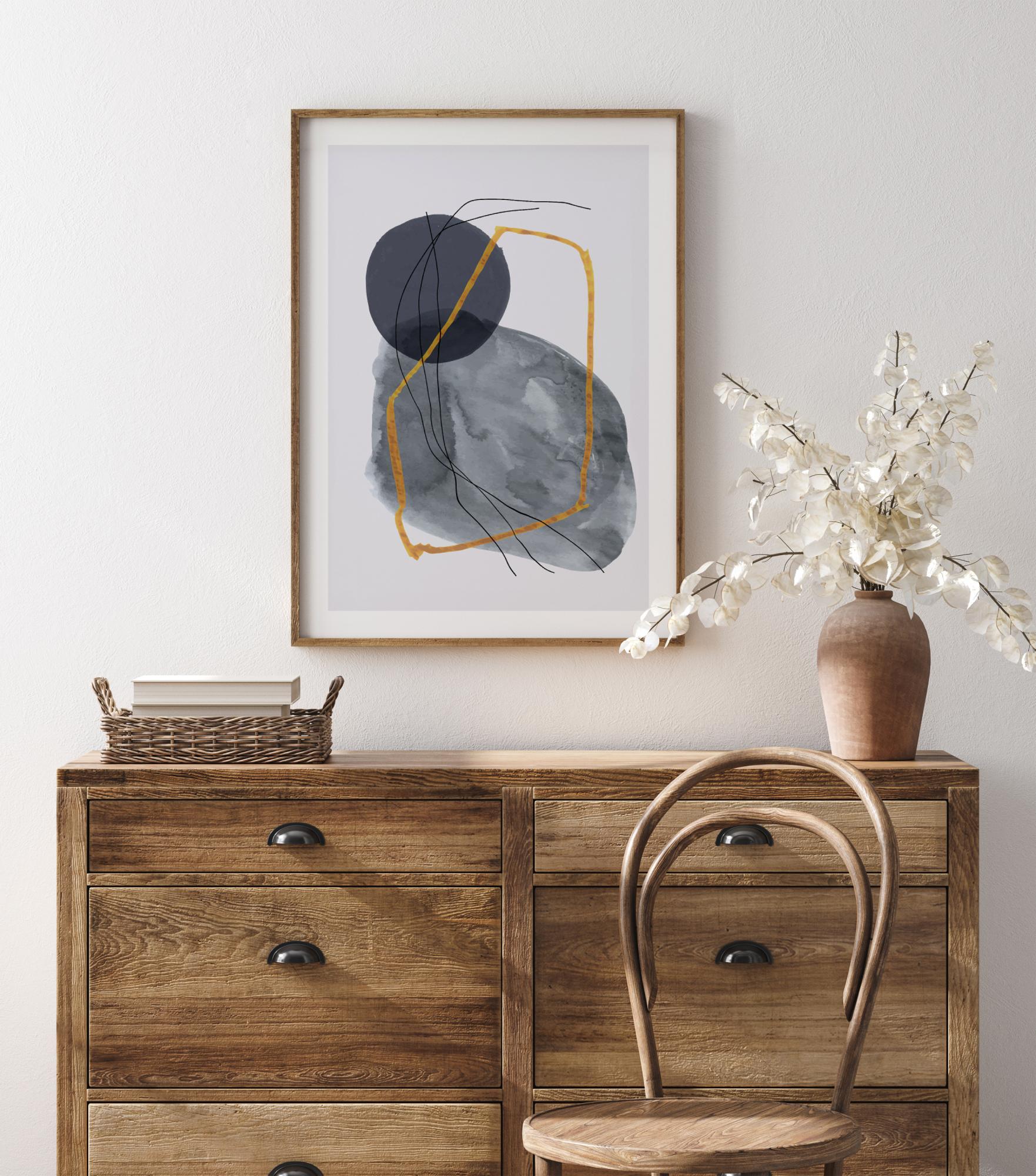 Ein geometrisches Poster mit verschiedenen blauen Formen auf grauem Hintergrund. Eine große malerische blaue Form füllt den Bildschirm mit einem weichen grauen Kreis über ihr. Schwarze Linien schlängeln sich hindurch, und eine dicke goldene Linie bildet eine dritte Form über dem Kreis und sorgt für ein einzigartiges und interessantes Bild.