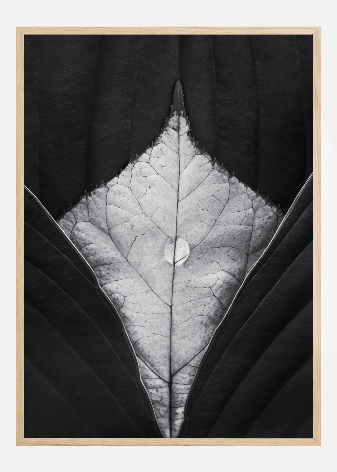 Ein Naturposter mit der Nahaufnahme eines Wassertropfens auf Blättern. Durch die Makroaufnahme der Blätter können Sie sehen, was Sie in dieser leicht abstrakten Aufnahme sehen möchten. Interpretieren Sie das Bild nach Belieben, wenn Sie es mit nach Hause nehmen.