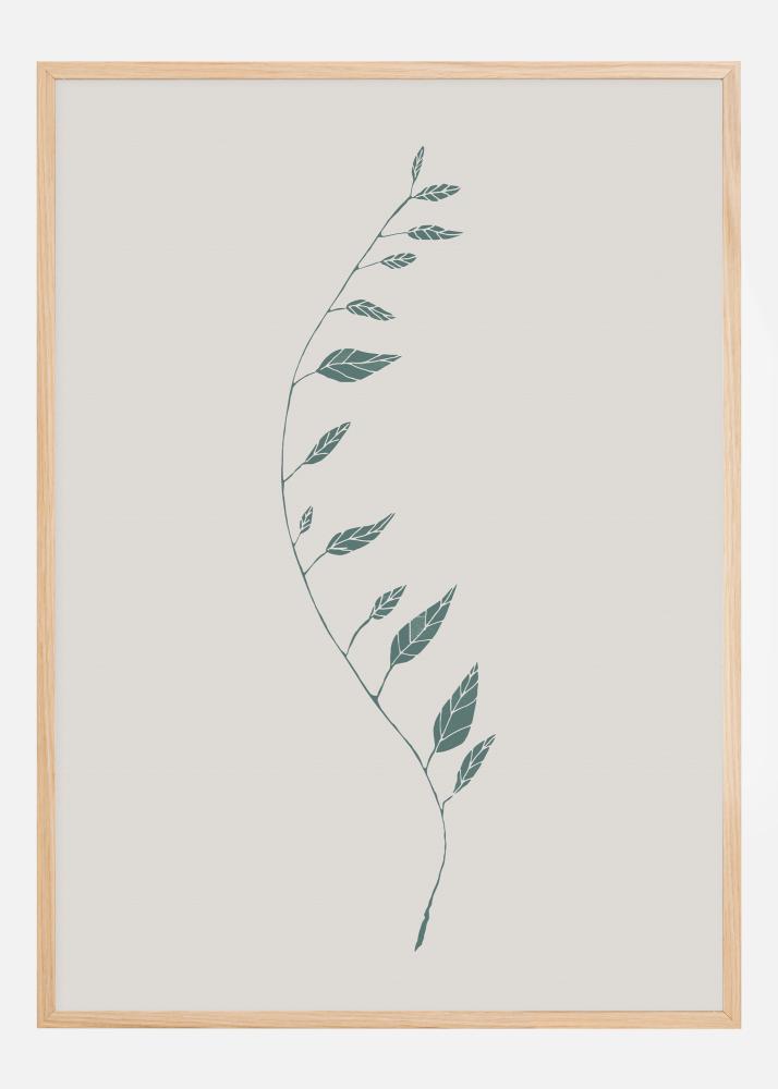 Ein minimalistisches Poster mit einem langen grünen Zweig, der sich sanft auf einem weißen Hintergrund windet. Die dünne Linie des Zweigs wogt sanft, alle Blätter sind auf der gleichen Seite, als ob ein Wind sie bläst. Seine Einfachheit vermittelt ein ruhiges Gefühl, ideal für eine entspannende Atmosphäre im Badezimmer.