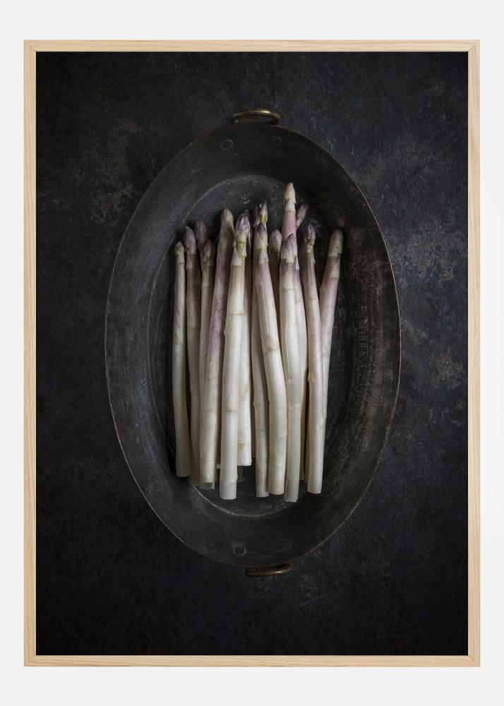 Ein Poster zum Thema Gemüse mit weißem Spargel, der in einer Pfanne liegt. Die weißen Spargelstangen heben sich kontrastreich von der dunklen schwarzen Pfanne und der Tischplatte ab. Hängen Sie dieses lustige Bild in Ihrer Küche auf, um sich beim Kochen inspirieren zu lassen.
