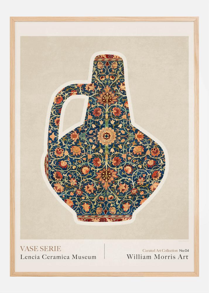 Dieses Poster, Nummer 04 in der "Curated Art Collection" des Lencia Ceramica Museums, ist eine reiche und komplexe Hommage an William Morris und seinen bedeutenden Beitrag zur Mustergestaltung. Hier wird eine stilvolle Vase präsentiert, bedeckt mit einem detaillierten und farbenfrohen Muster, das die Faszination der viktorianischen Ära für orientalische und mittelalterliche Kunst ausstrahlt, einen Stil, den Morris half zu popularisieren.