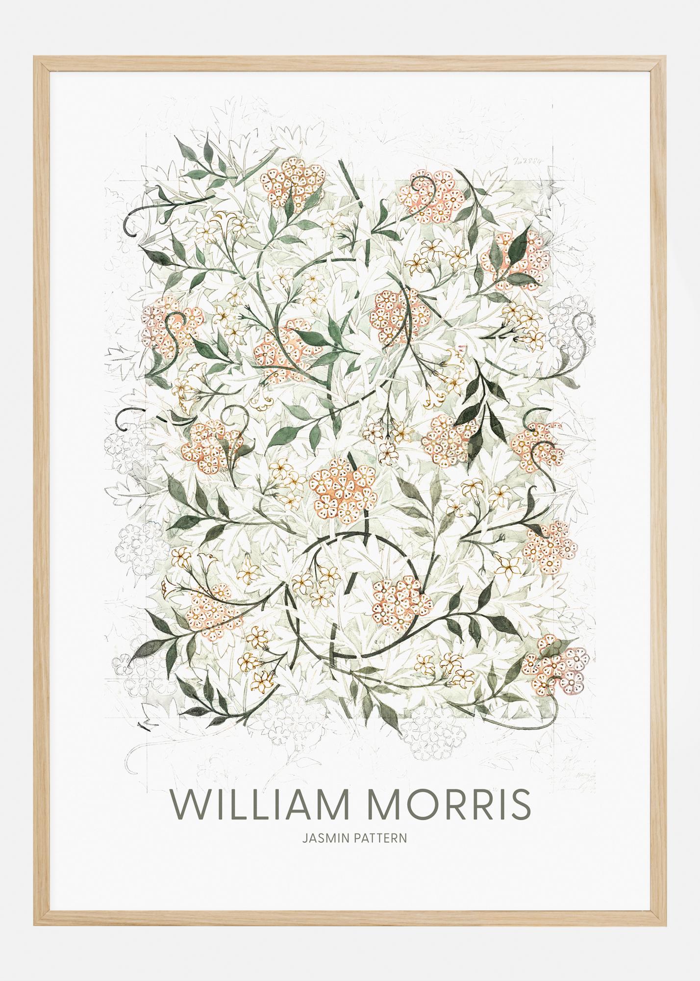 Dieses exquisite Poster präsentiert "Jasmin Pattern", ein weiteres zeitloses Werk des berühmten Designers William Morris. Das Muster ist eine liebliche Komposition aus Jasminblüten und Laubwerk, gefertigt mit einer Finesse und einer Liebe zum Detail, die charakteristisch für Morris ist. Das Farbschema ist eine sanfte und natürliche Palette, die die delikaten Formen der Blumen und die Blätter vor einem ruhigen Hintergrund hervorhebt.