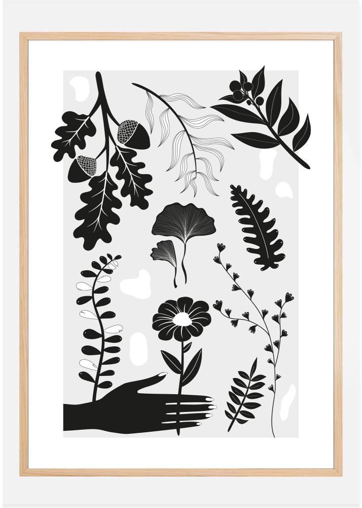 Ein kühnes Poster mit schwarzen und weißen Druckmustern von verschiedenen Blättern, Pflanzen und Blumen. Eine schwarze Hand streckt sich aus, um eine der stilisierten Blumen zu greifen. Eicheln, Blumen, Farne und mehr füllen diesen einfachen, aber interessanten Druck. Bringen Sie sich in Botanik-Stimmung, wenn Sie dieses Pflanzenposter in Ihrem Zuhause anbringen.