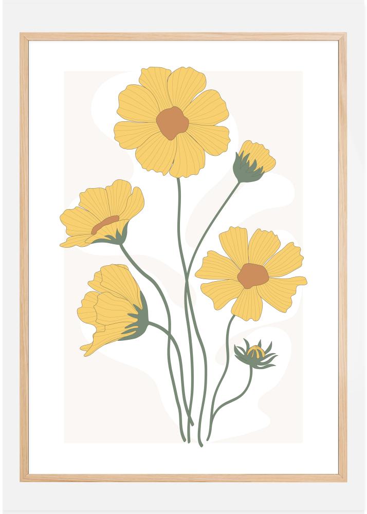 Ein leuchtendes Poster mit gelben Ringelblumen in einem lustigen Druckstil. Jede der Blumen leuchtet vor dem weißen Hintergrund. Obwohl es sich um ein einfaches, stilisiertes Design handelt, sind die Blumen fröhlich und der perfekte Weg, um mit einem Lächeln im Gesicht aufzuwachen.