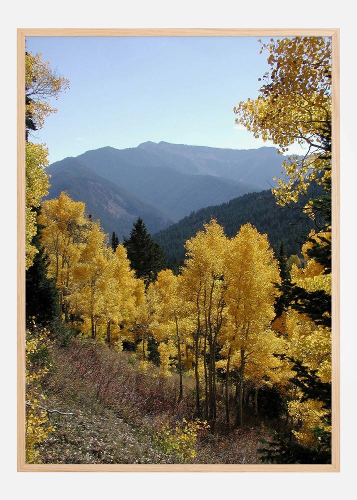 Ein heller Landschaftsdruck mit gelben Bäumen und einer blauen Bergkette im Hintergrund. Die gelben Bäume erhellen diese Waldszene und sorgen für ein wahres Indian-Summer-Feeling. Spüren Sie die warme Brise über den Bergen in diesem frühherbstlichen Bild.
