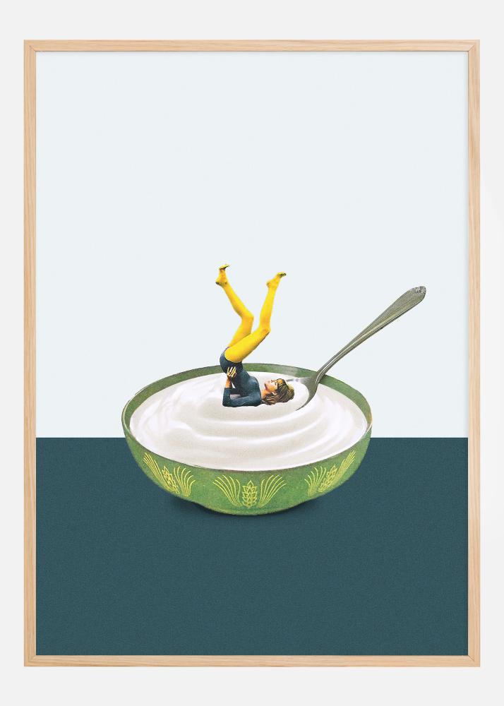 Dieses einzigartige und verspielte Poster präsentiert ein humorvolles Bild einer Person, die eine Yoga-Pose ausführt, eingetaucht in eine Schüssel mit Joghurt, komplett mit einem Paar spielerisch gelber Hosen, die die umgekehrte Position ergänzen. Das kreative Bild kombiniert Elemente des Surrealismus und alltäglichen Humors und ist eine erfrischende Abweichung von traditioneller Kunst und Dekoration. Der zweifarbige Hintergrund trägt dazu bei, die ungewöhnliche Komposition hervorzuheben und macht sie zu einem Gesprächsstarter.