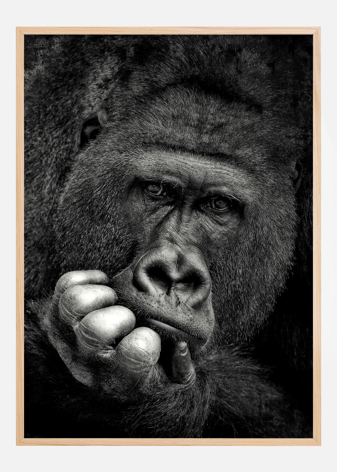 Ein atemberaubendes Porträtposter eines Gorillas in einer nachdenklichen Pose. Der Gorilla starrt mit unkonzentriertem Blick in die Kamera. Eine Hand ist unter dem Kinn zusammengerollt, als würde er über wichtige Fragen nachdenken. Der Schwarz-Weiß-Druck hebt alle Details im Gesicht dieses unglaublichen Menschenaffen hervor.