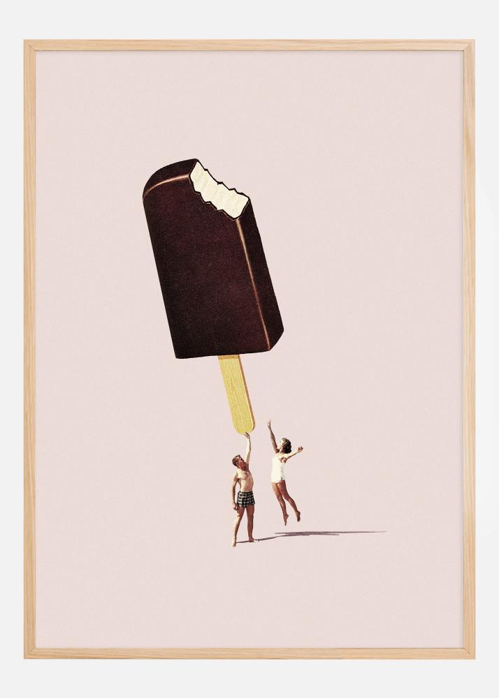 Dieses charmante Poster zeigt ein einzigartiges und verspieltes Bild von zwei Personen, die scheinbar ein gigantisches Eis am Stiel gefunden haben! Mit seiner fantasievollen Komposition und einem warmen pastellrosa Hintergrund bietet dieses Bild ein Gefühl von Sommerfreude und Nostalgie. Die fröhlichen Figuren, gekleidet in einfachen Badesachen, greifen nach dem Eis am Stiel, das mit einem realistischen Aussehen und einem herausgebissenen Stück eine herrliche Kontrast zur minimalistischen Umgebung bietet. Diese kreative und lebendige Szene zieht die Aufmerksamkeit des Betrachters auf sich und weckt Erinnerungen an sonnige Tage.